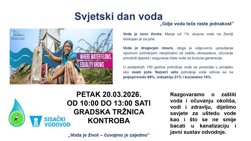 Povodom Svjetskog dana voda koji se inače obilježava 22.03. Sisački vodovod d.o.o. i Zavod za javno zdravstvo SMŽ organiziraju prigodno događanje s ciljem podizanja svijesti o važnosti očuvanja i zaštite vodnih resursa, odgovornog odnosa prema prirodi i okolišu te utjecaja vode na zdravlje i život ljudi.